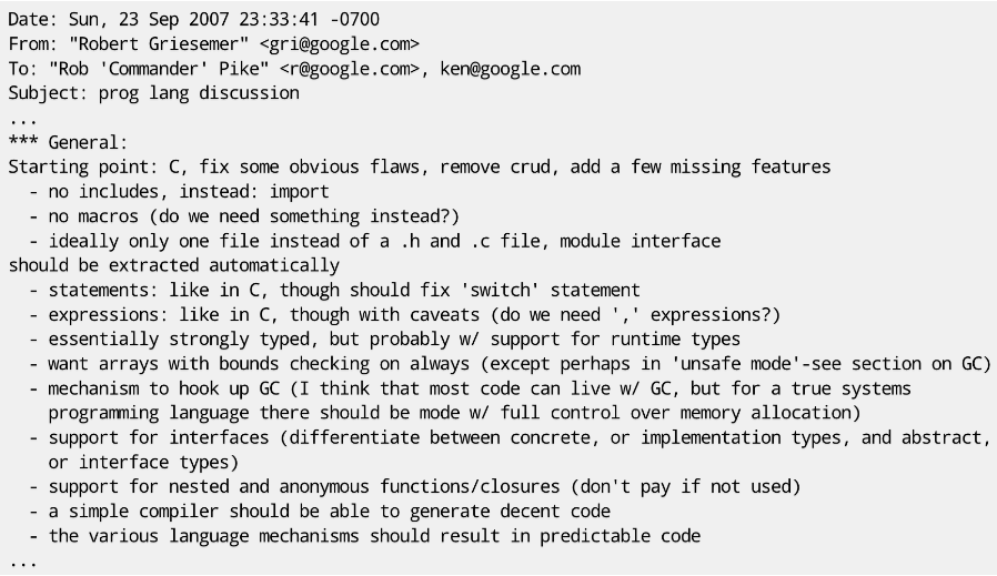 第一天的闲聊初有成效,他们迅速构想了一门新语言:能够给程序员带来快乐,能够匹配未来的硬件发展趋势以及满足 Google 内部的大规模网络服务。并且在第二天,他们又碰头开始认真构思这门新语言。第二天会后,Robert Griesemer 发出了如下的一封邮件: