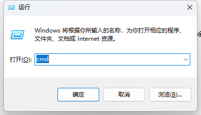 打开命令行:win + R 打开运行框,输入 cmd 命令,打开命令行窗口。