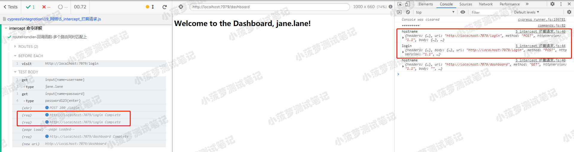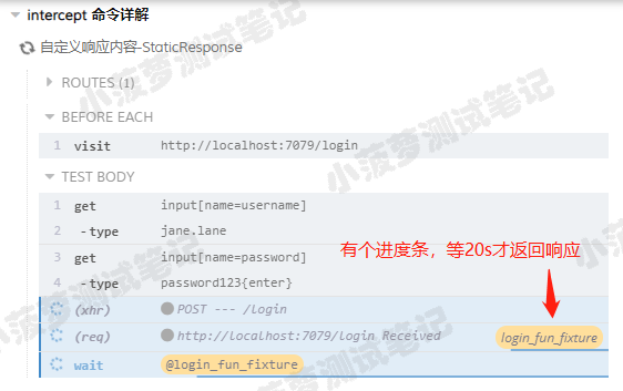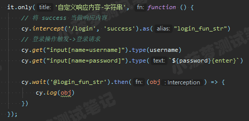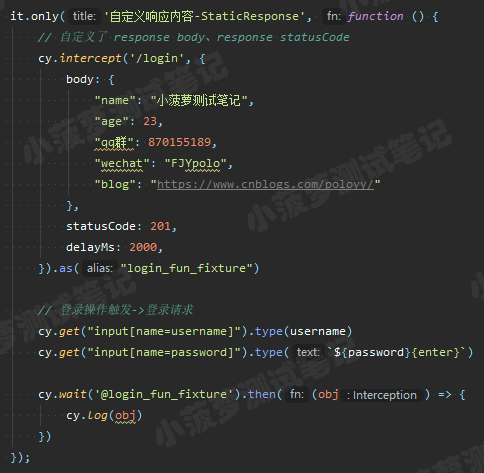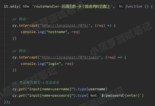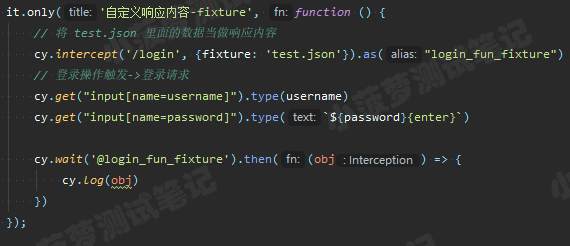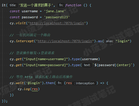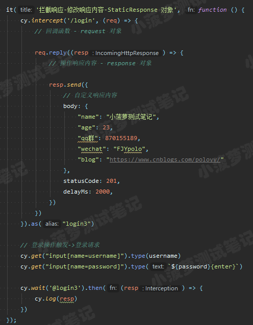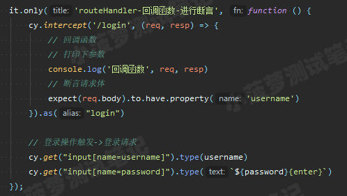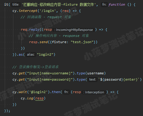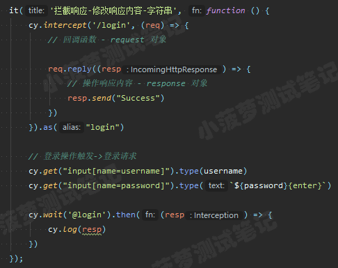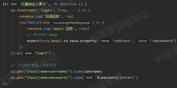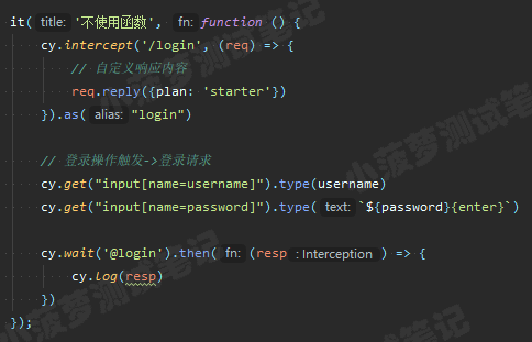 cy.intercept('/login', (req) => {// functions on 'req' can be used to dynamically respond to a request here// 将请求发送到目标服务器req.reply()// 将这个 JSON 对象响应请求req.reply({plan: 'starter'})// 将请求发送到目标服务器, 并且拦截服务器返回的实际响应, 然后进行后续操作(类似抓包工具对响应打断点)req.reply((res) => {// res 就是实际的响应对象})