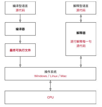 - 解释型语言:解释型语言编写的程序不进行预先编译,以文本方式存储程序代码,会将代码一句一句直接运行。在发布程序时,看起来省了道编译工序,但是在运行程序的时候,必须先解释再运行