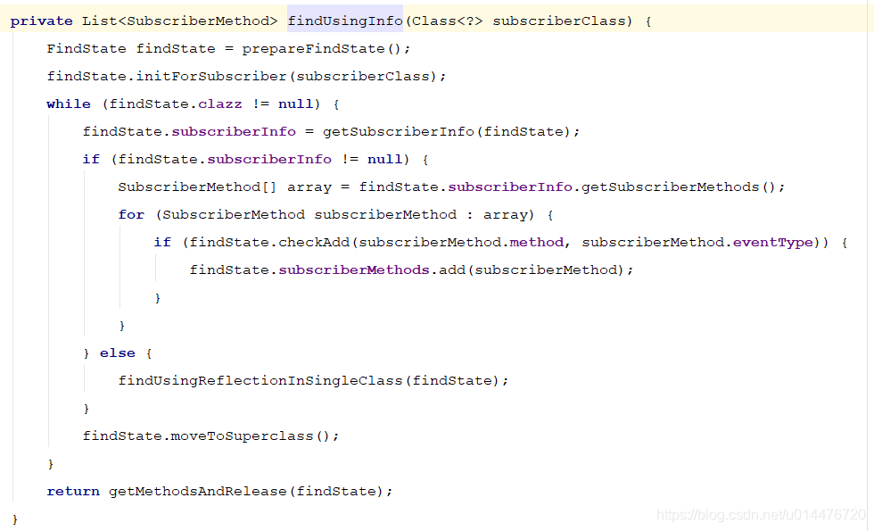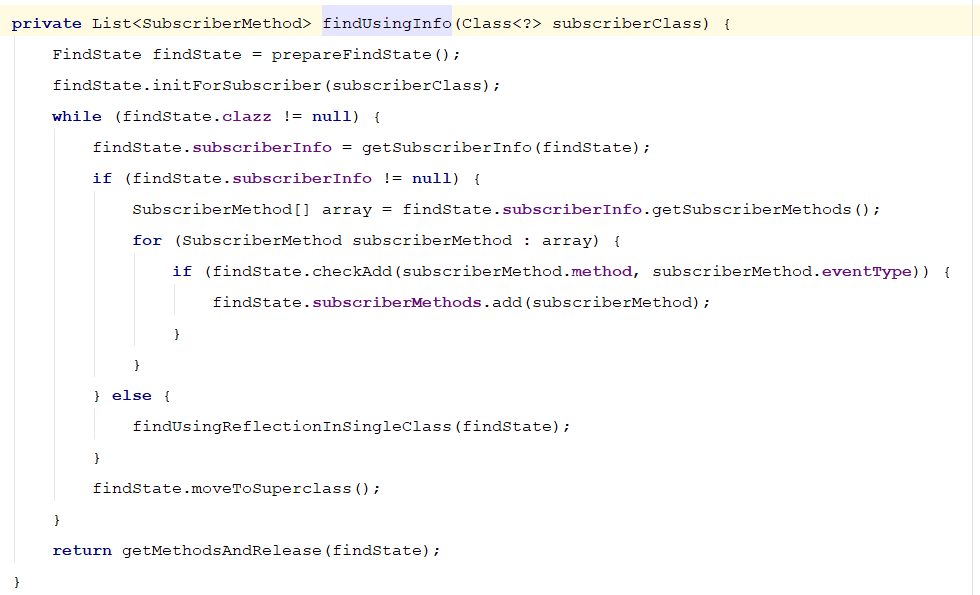 如果你配置好了订阅者索引,下面代码就不会跑用反射获取订阅者方法,而是直接从getSubscriberInfo这个方法里面获取,这个方法里面就是处理你添加的订阅者索引数据的