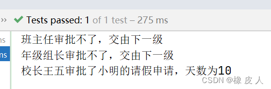 public class TestChain {@Testvoid testChain(){Approver classAdviser = new ClassAdviser("张三");Approver gradeLeader = new GradeLeader("李四");Approver schoolMaster = new Master("王五");//组织责任链classAdviser.setNext(gradeLeader);gradeLeader.setNext(schoolMaster);//发起请求LeaveRequest request = new LeaveRequest("小明", 10);classAdviser.approve(request);}