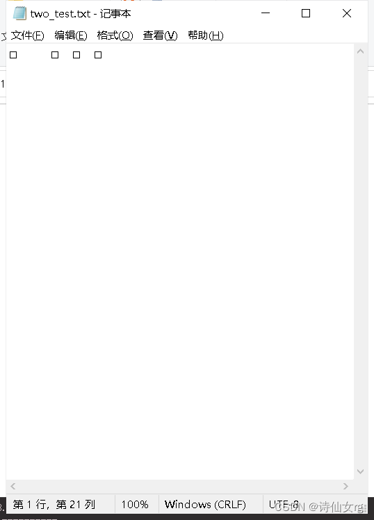 {FILE* pf = fopen("two_test.txt", "wb");if(pf == NULL){perror("fopen");return 1;}//写文件int arr1[] = { 1,2,3,4,5 };fwrite(arr1, 4, 5, pf);fclose(pf);pf = NULL;return 0;}