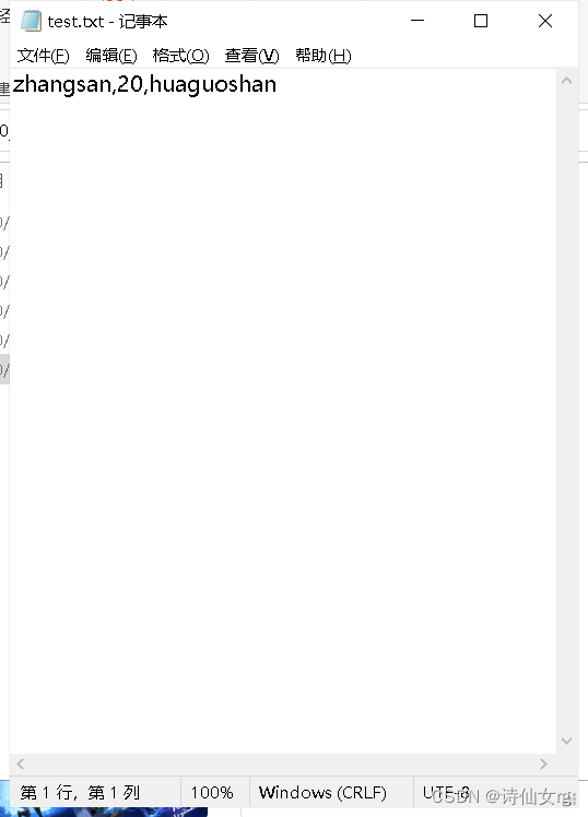 {struct peop peop1 = { "zhangsan",20,"huaguoshan" };FILE* pf = fopen("test.txt", "w");if (pf == NULL){perror("fopen");return 1;}fprintf(pf, "%s,%d,%s", peop1.name, peop1.age,peop1.home);fclose(pf);pf = NULL;return 0;