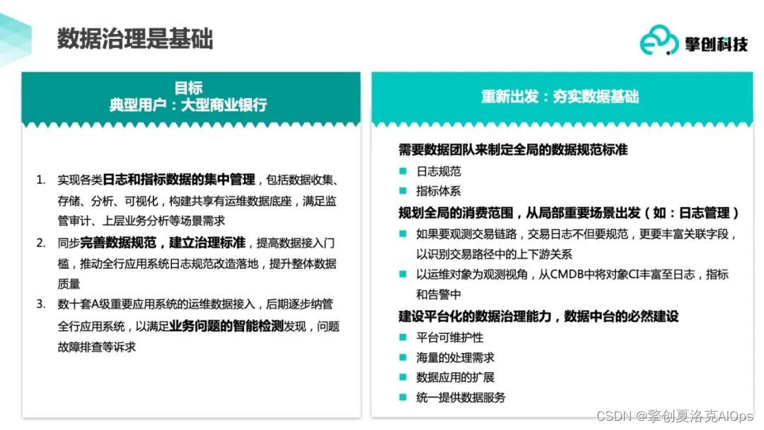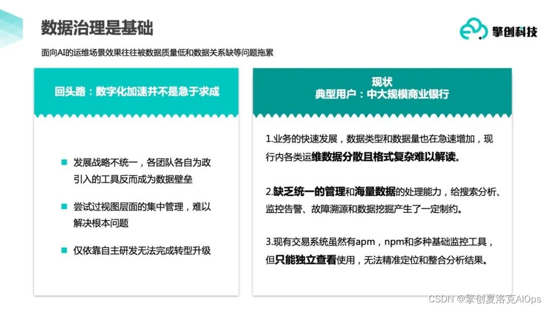 在接触的金融行业客户时,我们发现很多中大型商业银行在走回头路,之前由于急于求成,在没有统一的发展战略、各个团队各自为政以及工具有大量数据壁垒的情况下,做界面的集中或者可视化的集中,这会使得面向AI的运维场景效果往往被数据质量低和数据关系缺等问题拖累。