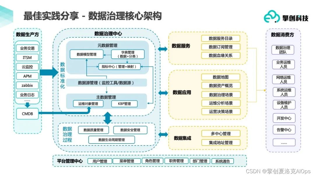 以指标为例,这些生产方中有交易类指标、有管理类的KPI(ITSM)、有云监控或普通监控产生的服务器或网络的性能指标等等。这些指标之间本身是不存在任何关系的,需要通过CMDB作为一个关系的桥梁,去转化和映射到数据管理当中去,进而通过不同的分类、属性、关键属性等等去进行分别的治理,最后转化到数据服务、数据应用、数据集成这三大输出能力板块中,为后续的消费方提供服务,使数据能被消费方真正拉通,以便在对应的场景去进行消费使用。