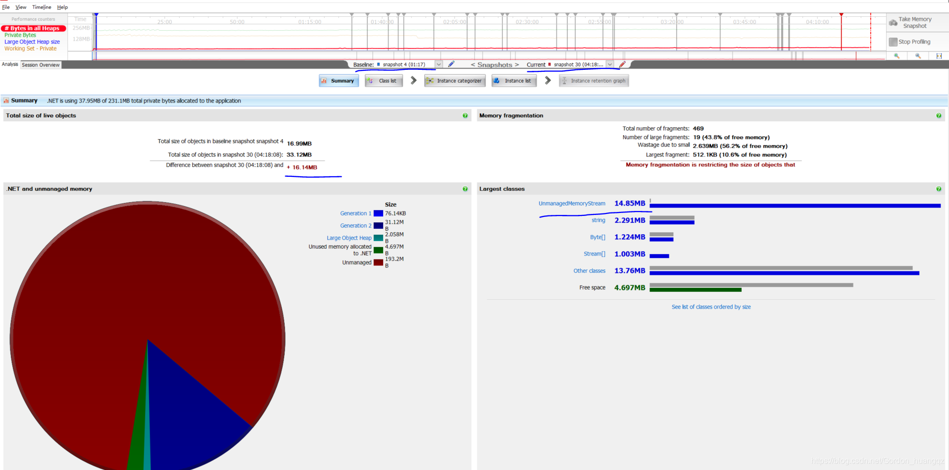 2.经过录制我就得到了下面的数据,可以看画线的部分,代表从 01:17到04:18这4分钟内,内存增长了16.14MB。而我们的UnmanagedMemoryStream增长了14MB,就确定这个罪魁祸首了。
