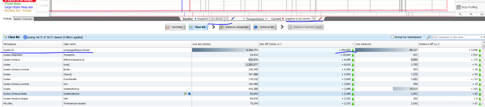 3.知道内存原因是因为UnmanagedMemoryStream这个后,就一分钟的截取快照实例,关注它得增长,发现它一直在增长。