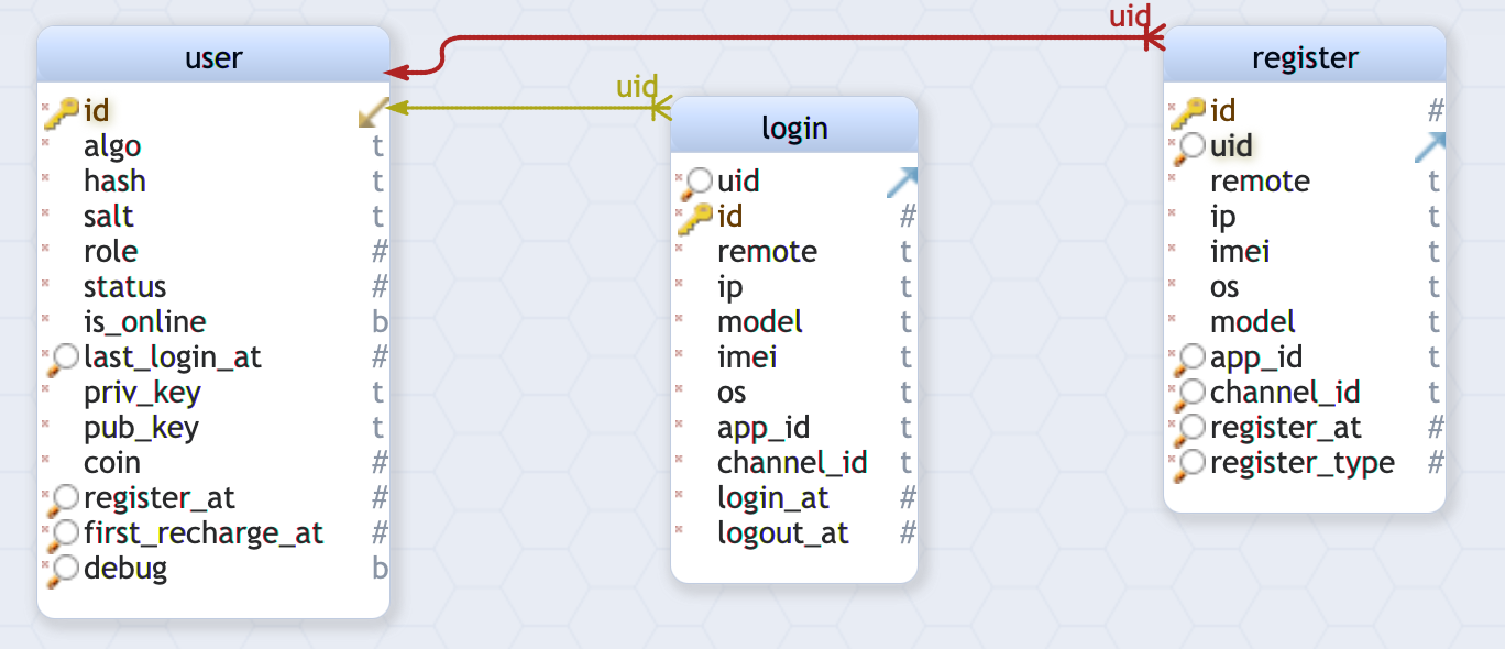 type User struct {Id int64Algo string `xorm:"not null VARCHAR(16) default"`Hash string `xorm:"not null VARCHAR(64) default"`Salt string `xorm:"not null VARCHAR(64) default"`Role int `xorm:"not null TINYINT(3) default 1"`Status int `xorm:"not null TINYINT(3) default 1"`IsOnline int `xorm:"not null TINYINT(1) default 1"`LastLoginAt int64 `xorm:"not null index BIGINT(11) default"`PrivKey string `xorm:"not null VARCHAR(512) default"`PubKey string `xorm:"not null VARCHAR(128) default"`Coin int64 `xorm:"not null BIGINT(20) default 0"`RegisterAt int64 `xorm:"not null index BIGINT(20) default 0"`FirstRechargeAt int64 `xorm:"not null index BIGINT(20) default 0"`Debug int `xorm:"not null index TINYINT(1) default 0"`