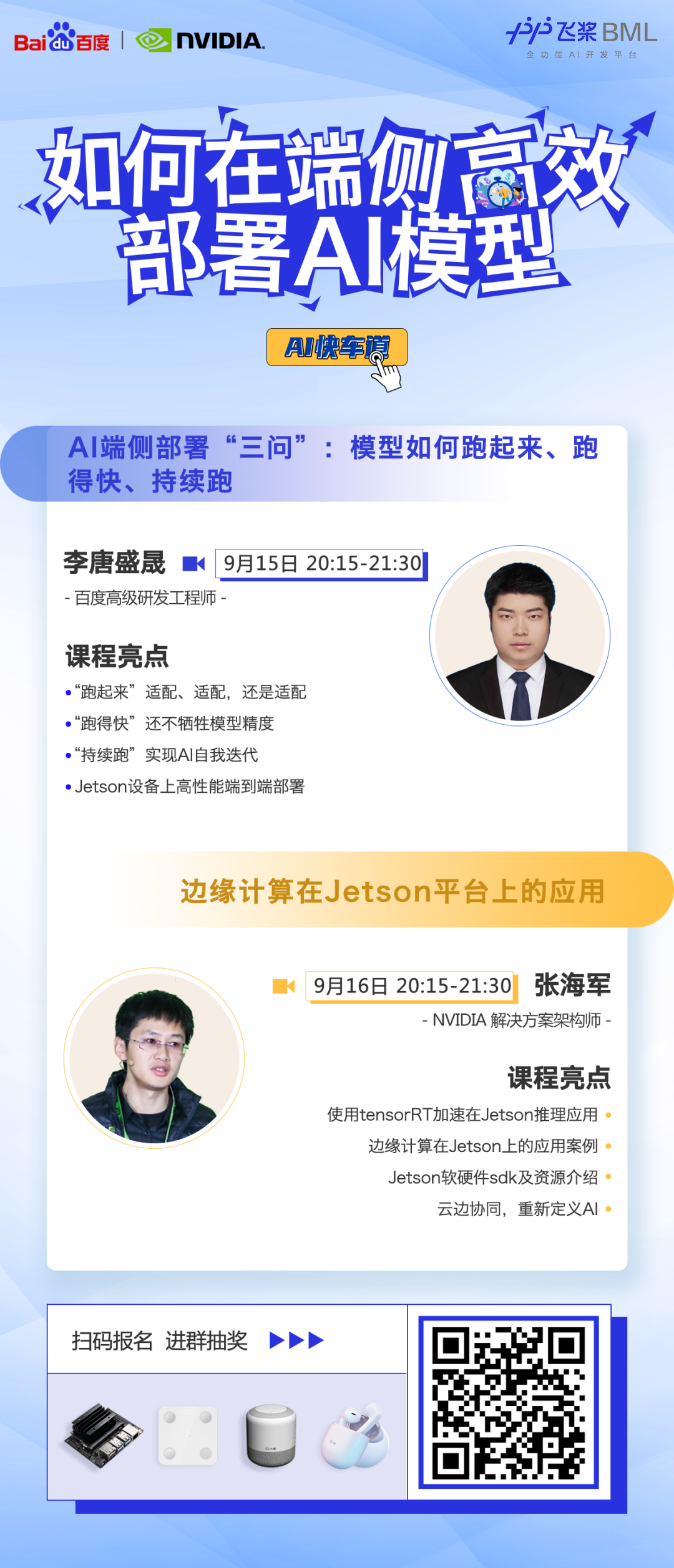 9月15-16日,邀请您参加百度AI快车道-BML线上课程,百度技术专家将联合英伟达解决方案专家一起探讨如何在端侧高效部署AI模型,诚邀您的参与。