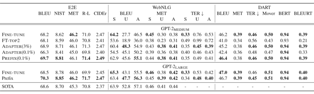 Experiments:简单看看实验结果,对于 table-to-text 生成的实验,使用如下三个数据集,Prefix-tuning 以较少的参数量得到了大多数 metric 上较好的性能。