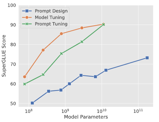 本文有一个非常有意思的地方,如下图所示。prompt-tuning 作为 prompt-design 和 model tuning 之间一个折中的方法,随着模型大小的增大,一度赶上了 model tuning 的性能。使用很少的参数做 tuning 性能大大超出手工设计的 prompt。