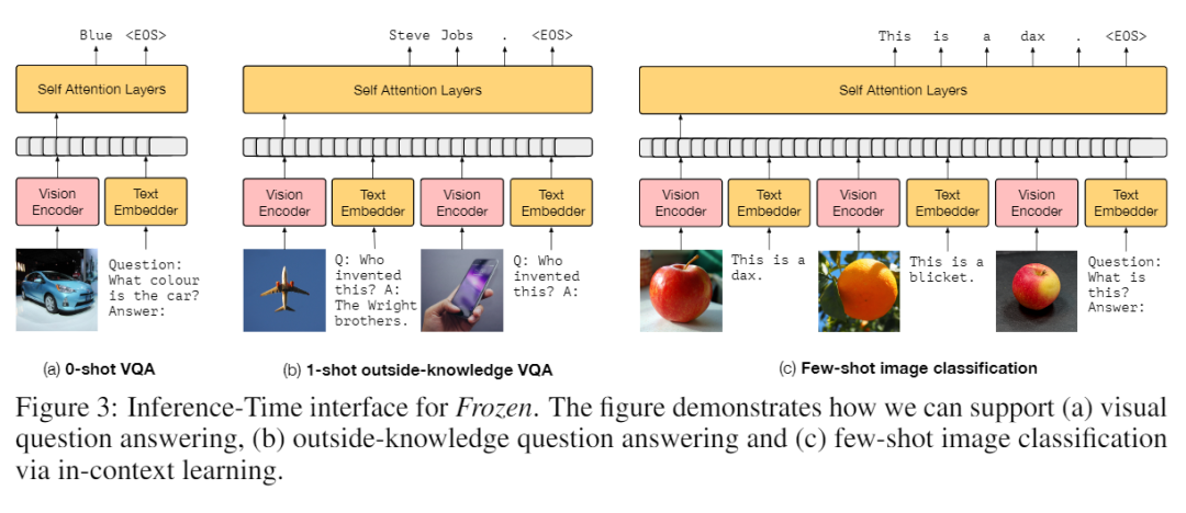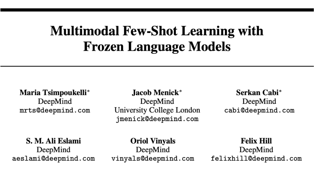 训练过程稍微有点特殊,训练时统一使用 Conceptual Captions 作为训练集,Conceptual Captions 的输入是一张图片,输出是关于此图片的描述,所以在训练时语言模型是在做生成任务。训练时还固定了 LM 的所有参数,仅优化视觉编码器的参数。这是因为 few-shot 场景下数据较少,若不固定 LM 的话,反而会破坏 LM 原有的信息,甚至使模型产生灾难性遗忘。