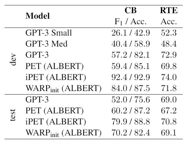 在 few-shot learning 的 setting 下,使用 SuperGLUE benchmark,WARP 超过了 PET 和 GPT-3。