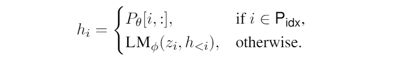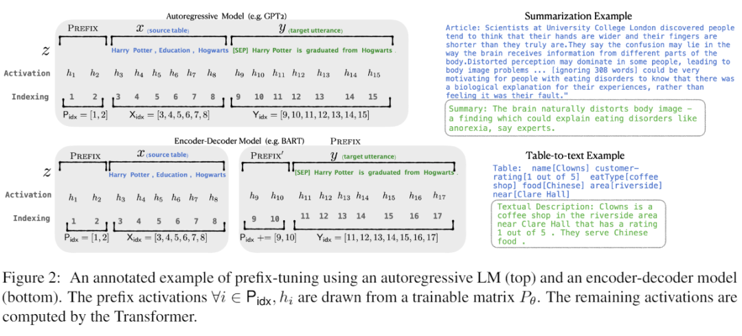 Method:本文对 LM 每一层的输入添加一个 prefix ,或者对 source,target 端添加不同的 prefix ,这里使用 表示 prefix 的索引, 表示 prefix 的长度。prefix-tuning 初始化一个前缀矩阵 ,如果索引值属于 prefix 的 ids,那就从 prefix 矩阵中拿出该 id 对应的 embedding,如果不是,那么 就是上一步计算出来的 embedding。值得注意的是,即使是第二种情况, 也是和 相关的,因为在其左侧的文本里依然存在 prefix。