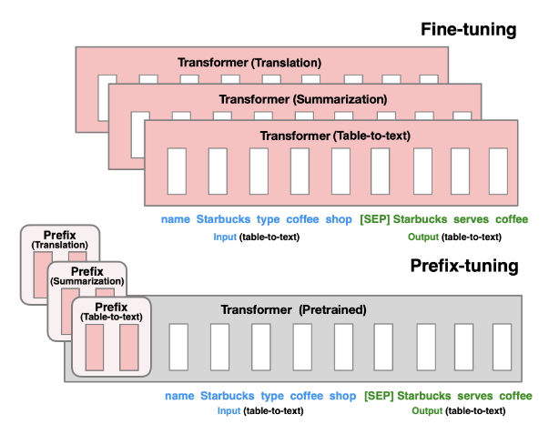 Prefix-Tuning 在该任务的输入前加上一个任务特定的连续序列(prefix),即下图下方红色的部分。与 prompt 相比,这里不再是真实的 token,而是连续序列。和 finetune 相比,finetune 优化的是整体的参数,而这里只对每个任务优化对应的 prefix。