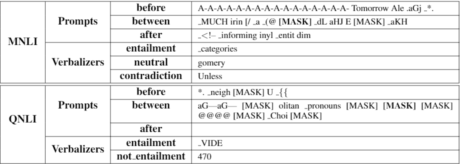 在可解释性方面,作者通过寻找距离 embedding 最近的 token 来进行离散化,我们摘取两个任务对应的 prompt 来看一看,可以看到基本上没有啥真实的语义信息。相比之下 就比较好解释了,对 MNLI 的“contradiction”类的 embedding 接近于 token “unless”。SST-2 任务中“negative”和“positive”类的 embedding 分别接近于“defective”和“important”。