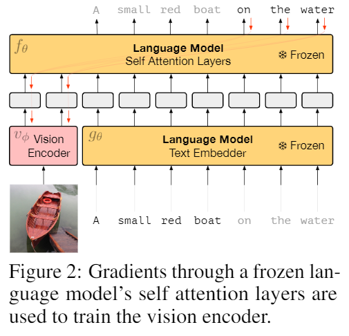 本文提出一种叫做“Frozen”的模型结构,它的主要思想是:利用图像编码器把图像作为一种动态的 prefix,与文本一起送入 LM 中,从而更好地获得 LM 中的先验知识,此外,为了将 LM 中的知识迁移到多模态领域,在训练时选择冻结 LM 的参数,仅优化图像编码器有关参数,模型结构如下图所示: