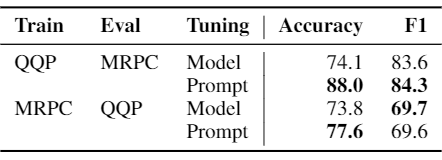 文章在一个 source domain 上训练出 prompt,然后将他直接用于 target 数据集进行 evaluation。结果如下所示,prompt-tuning 显示出了比 model fine-tuneing 更鲁棒的结果。