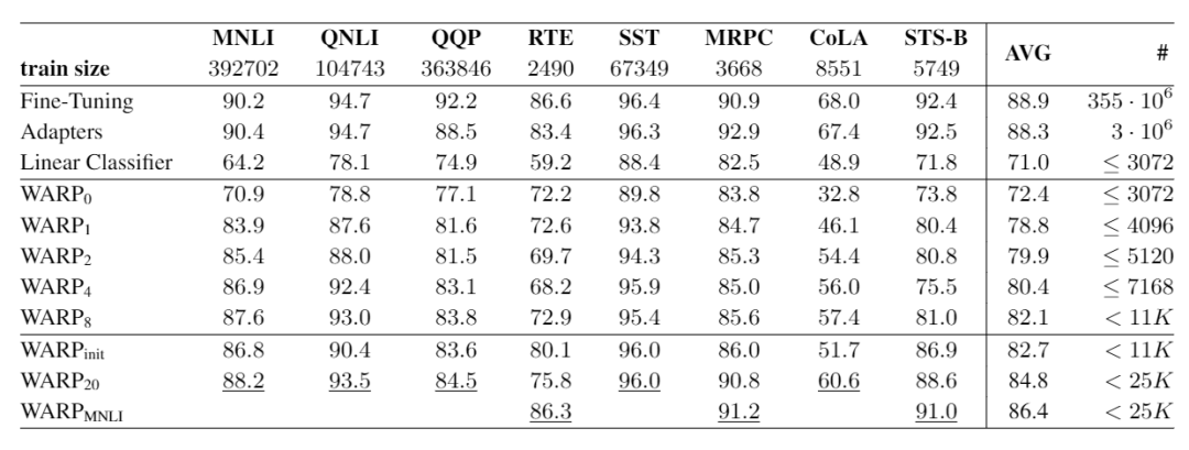 在最常用的 benchmark GLUE上,WARP 取得了非常不错的效果,并且参数量少了好多个数量级。下表中的 # 表示训练的参数量。