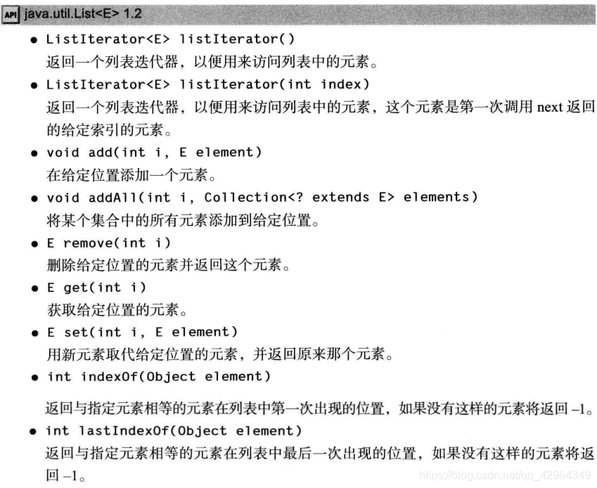 可以采用两种方式访问 List 的元素:使用迭代器访问,或者使用一个整数索引来访问。后一种方法称为随机访问,因为这样可以按任意顺序访问元素。与之不同,使用迭代器访问时,必须按照集合的元素顺序访问元素。