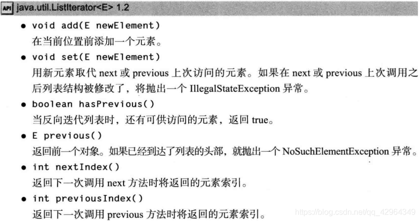 interface ListIterator<E> extends Iterator<E>{void add(E element); //它假定这个添加操作总会改变链表...