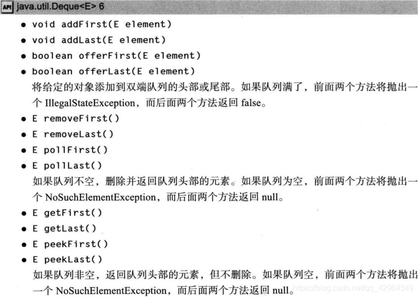 在 Java SE 6 中引入了 Deque 接口,并由 ArrayDeque 和 LinkedList 类实现。这两个类都提供了双端队列,而且在必要时可以增加队列的长度。