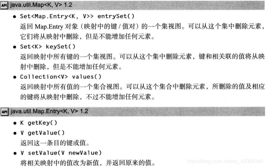 映射有3种视图:键集、值集合(不是一个集)以及键值对集。键和键值对可以构成集,是因为映射中的一个键只能有一个副本。