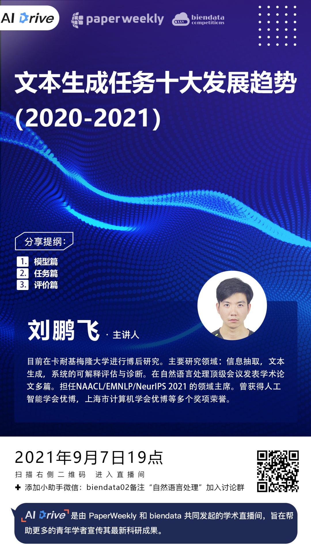 本期 AI Drive,我们邀请到卡耐基梅隆大学博士后刘鹏飞,为大家带来文本生成任务十大发展趋势(2020-2021)专题直播。对本期主题感兴趣的小伙伴,本周二晚 7 点,我们准时相约 PaperWeekly B 站直播间。