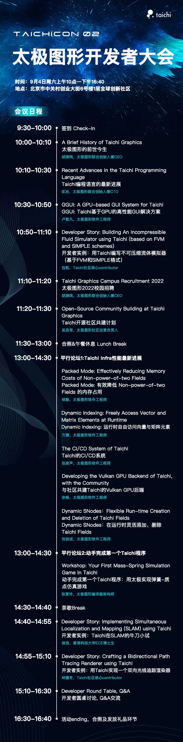 TaichiCon始于2020年5月,并在2021年4月再次举办。前两次活动聚集了众多计算机图形学行业的资深工程师与核心开发者,一同分享并交流Taichi相关技术。在大家的期待中,TaichiCon 02将于今年9月4日重磅回归。我们将在北京中关村创业大街6号楼举行一场面向开发者的技术交流盛会。届时,太极图形的联合创始人们将亲临现场,同步Taichi编程语言的最新进展,并与所有参会的开发者们面对面交流。同时,本场大会也特邀3位社区核心Contributors,他们将分享基于Taichi创造出的精彩项目。