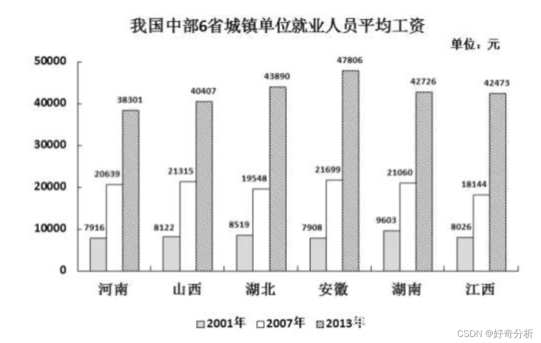 解析:2013年六省平均值为:(38301+40407+43890+47806+42726+42473)/6=42600.5。2001年六省平均值为:(7916+8122+8519+7908+9603+8026)/6 = 8349。