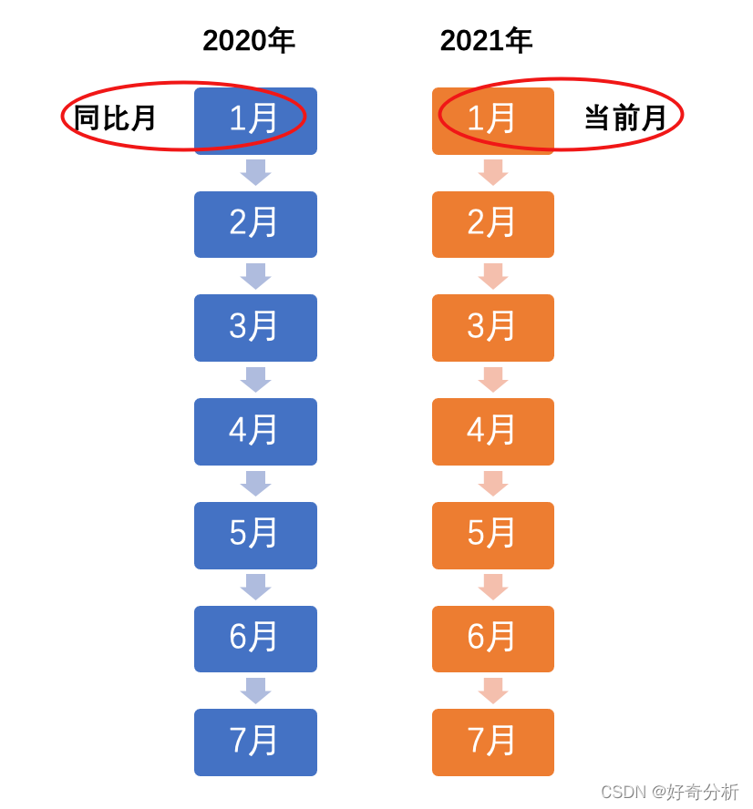 如果要挑选一个最容易混淆的概念,我个人首选是这个。很多同学在新闻报道中都有听到过这类的词语,如“2020年3月全国肉及肉制品出口为139641万元,环比增加22.8%,同比增加21.5%“,如“2020年一季度河南省粮食总产量为10054万吨,同比增长5.7%,环比增长4.6%”。我们自己在做相关数据分析时,也经常会使用到类似表达,如“2021年7月销量为8000件,同比增加X%,环比增加X%" 。因此如果我们对同比和环比的概念混淆了,对应的表达结果可能就大相径庭。