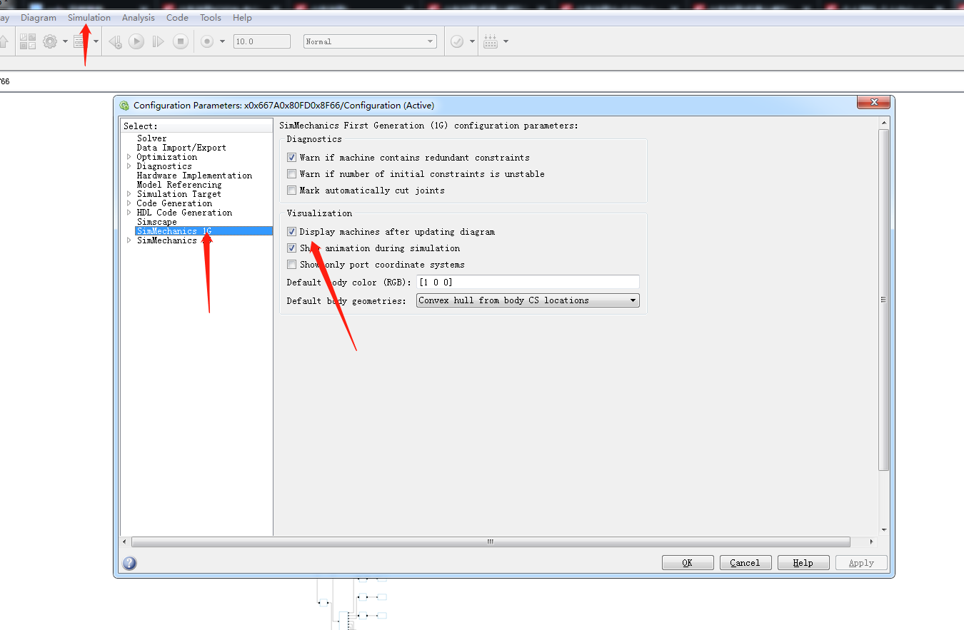 solidworks安装SimMechanics Link的操作步骤在这里就不多说了,后期单独制作一个安装流程说明,solidworks使用SimMechanics Link导出文件格式是.xml,这个文件可以使用MATLAB打开,运行一下就能把需要仿真的模型自动建立起来,然后就可以用其相应的simulink进行操作仿真,值得一提的是我再做这件事情时出现了一些bug,需要稍作修改。各位先参考这位博客分享:https://blog.csdn.net/u012370512/article/details/80074541