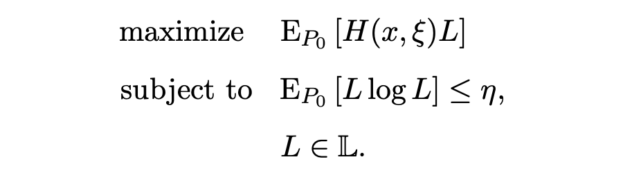 到现在为止,我们内层的优化目标是概率分布 ,而 并没有在目标函数中出现,这就很难优化。作者采用了 change-of-measure 的技巧,首先我们记 为似然比(likelihood ratio),也称之为迪姆导数(Radon-Nikodym derivative),我们可以轻易的得到 ,然后使用 change-of-measure 将 KL 散度转化为:
