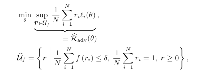 这里的 是一个有 个样本点的经验数据分布。接下来使用 表示 DRO 的 uncertainty set,这是一个包含经验数据分布的分布, 是从 uncertainty set 中采样的分布, 表示真实数据分布。