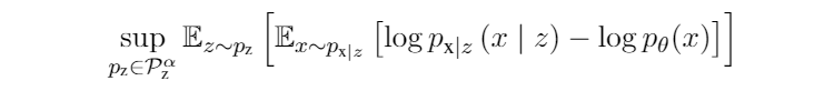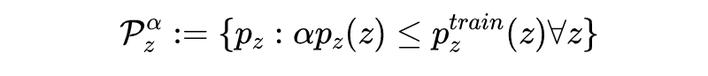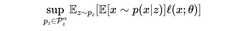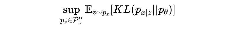 本文使用生成模型对 uncertainty set 进行建模。但是不是所有的生成模型都可以表达有用的数据分布(如果 太大就会有噪音数据),因此文中使用 KL 散度约束模型分布与真实数据分布之间的距离,文中提出的 Parametirc DRO 如下所示: