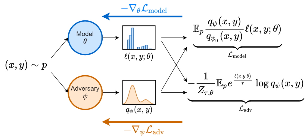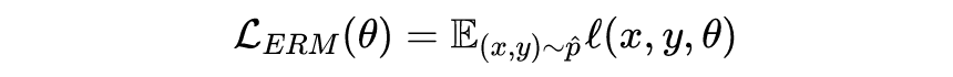 常见的算法使用经验风险最小化(ERM)的范式,有一个模型参数为 ,一个损失函数 和数据分布 ,通常情况下我们只能看到训练数据分布 ,那么 ERM 可以写作: