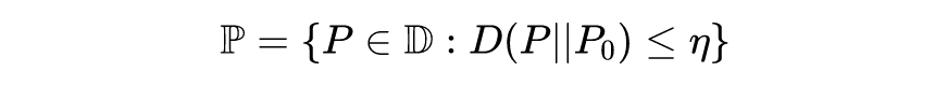 这里的 是参数集而 是 的数据分布, 作为 uncertainty set。本文第一次采取了如下方法来定义 uncertainty set,其中 是 KL 散度, 是我们对真实数据集的估计。