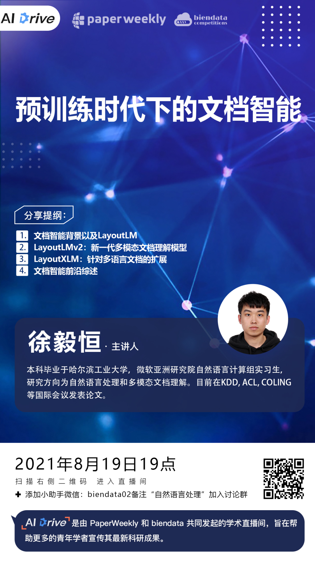 本期 AI Drive,我们邀请到微软亚洲研究院自然语言计算组实习生徐毅恒,为大家带来预训练时代下的文档智能专题直播。对本期主题感兴趣的小伙伴,今晚 7 点,我们准时相约 PaperWeekly B 站直播间。