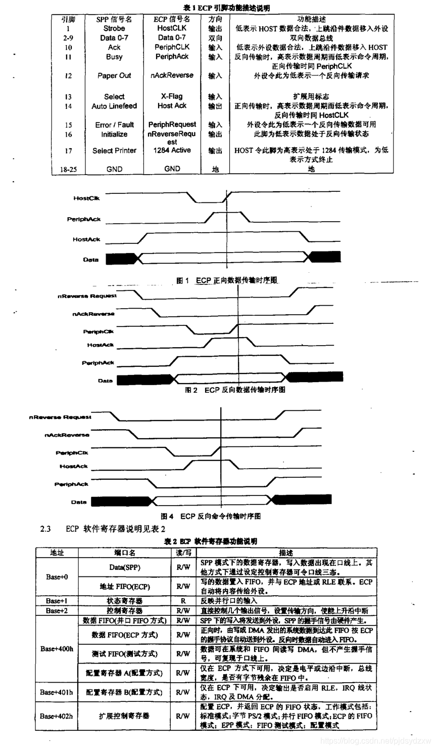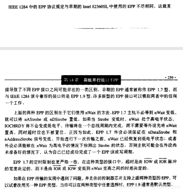 并口spp是由软件控制与设备的联络握手信号,epp是由硬件自动控制,有个缺点是如果设备接收很慢,会造成cpu忙等待。ecp也是硬件控制联络握手信号,并且添加了fifo缓存,还有dma控制,不需要忙等待。并口已经被淘汰,usb协议乍看很复杂,其实使用起来比并口还要简单,主机端可以使用libusb用户空间的驱动程序,省去编制驱动的麻烦,设备端使用usb芯片,只需要关心fifo的操作,USB协议只需要稍微了解,基本用不到。