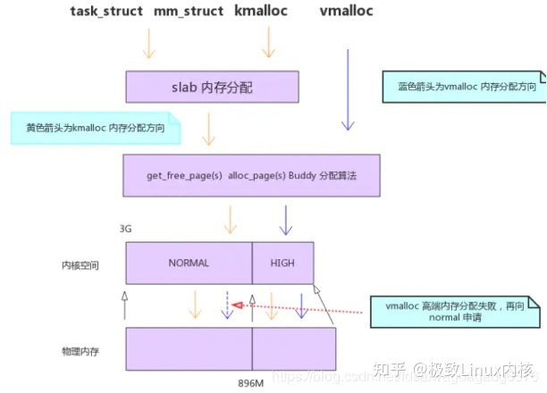 通过更改内核页表实现内核内存和物理地址的地址转换. vmalloc是从伙伴系统分配内存.