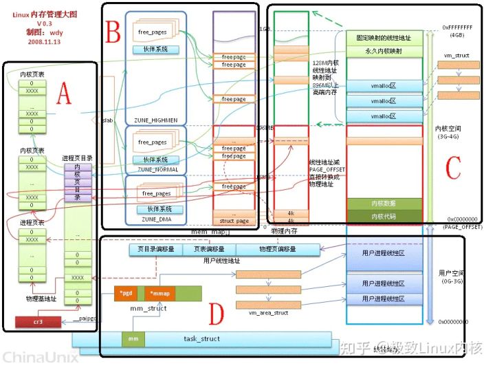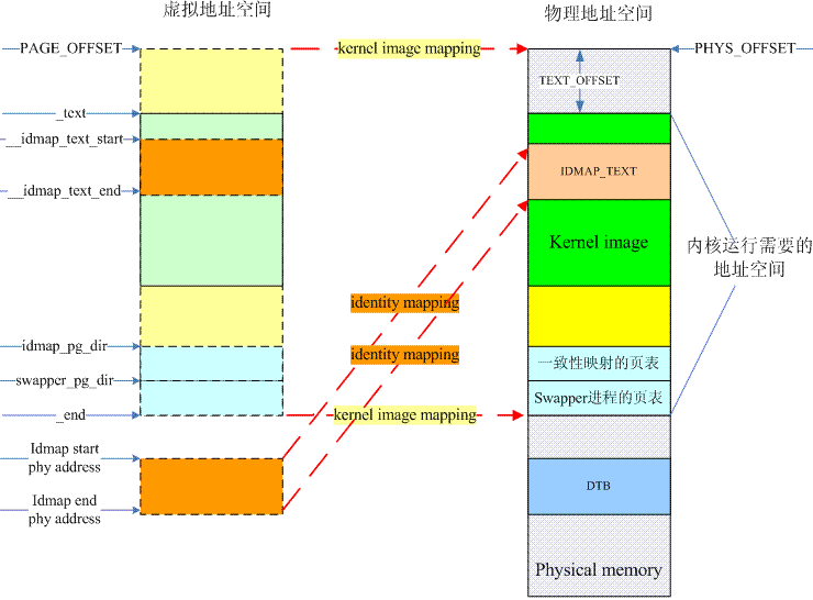 当内核模块代码或线程访问内存时,代码中的内存地址都为逻辑地址,而对应到真正的物理内存地址,需要地址一对一的映射,如逻辑地址0xC0000003对应的物理地址为0x00000003,0xC0000004对应的物理地址为0x00000004,… …,逻辑地址与物理地址对应的关系为