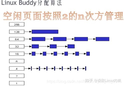 它把所有的空闲页框分组为11个块链表,每个块链表分别包含大小为1,2,4,8,16,32,64,128,256,512和1024个连续的页框.