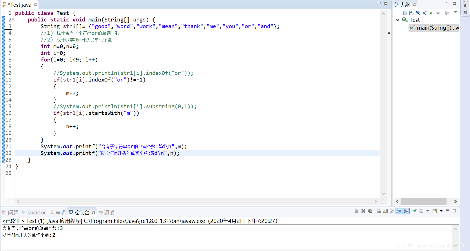 public class Test {public static void main(String[] args) {String str1[]= {"good","word","work","mean","thank","me","you","or","and"};//1) 统计含有子字符串or的单词个数;//2) 统计以字符m开头的单词个数。int m=0,n=0;int i=0;for(i=0; i<9; i++){//System.out.println(str1[i].indexOf("or"));if(str1[i].indexOf("or")!=-1){m++;}//System.out.println(str1[i].substring(0,1));if(str1[i].startsWith("m")){n++;}}System.out.printf("含有子字符串or的单词个数:%d\n",m);System.out.printf("以字符m开头的单词个数:%d\n",n);}