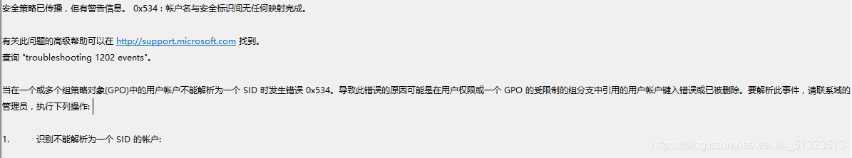 故障原因:组策略中配置的账户变更了名称或已删除,导致无法解析此账户。