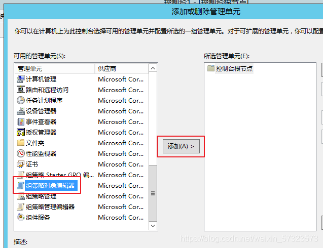 d. 在“添加独立管理单元”对话框中选择“组策略对象编辑器”,然后单击“添加”