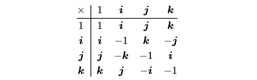 如果说复数是一个二维向量,那么四元数就是一个四维向量,表示为 ,这里的 ,但是它们本身都各不相等,几个基之间的运算规则是: