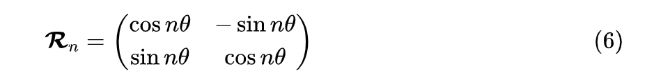 复数的矩阵映射也是 RoPE 的重要基础,在 Transformer 升级之路:博采众长的旋转式位置编码中我们已经推导得到 RoPE 的复数表示是 ,所以根据复数的矩阵映射, 就对应着矩阵: