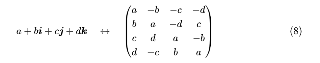 前面说了,四元数是复数是一种推广,事实上它还是矩阵的“鼻祖”,从历史上来说,是先有四元数然后才有一般的矩阵运算,并且四元数启发了矩阵的很多运算。早年笔者也写了《与向量的渊源极深的四元数》[3] 、《几何的数与数的几何:超复数的浅探究》[4] 等文章来介绍四元数,欢迎读者参考。