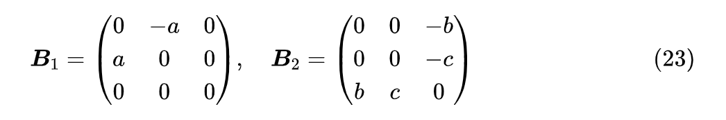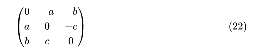 B[a_, b_, c_] = {{0, -a, -b}, {a, 0, -c}, {b, c, 0}};
